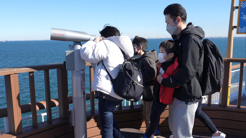 途中、東京湾上の高速道路にあるパーキングエリア「海ほたる」で下車。海を一望できる絶景が自慢のスポットです。望遠鏡をかわるがわるのぞき込むなど、一家の仲の良さが伝わるひとときでした。