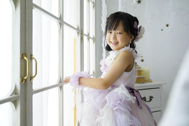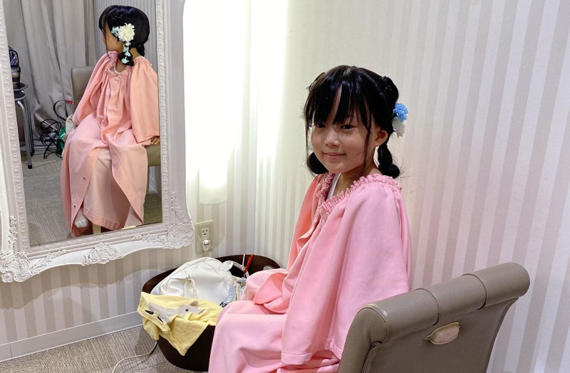 浴衣の次は、ゴージャスなお姫様風ドレス、そして最後はカジュアルファッションに着替えて撮影を行いました。服装に合わせて髪飾りをヘアピンに変えるなどのアレンジも加えます。撮影した写真は、後日アルバムにしてご家族に贈呈しました。