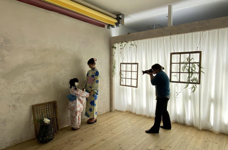 浴衣に着替えてスタジオ入り。カメラマンのリクエストに応えて2人で見つめ合ったり、ほほに手を当てたりと、次々にポーズを変えていきます。