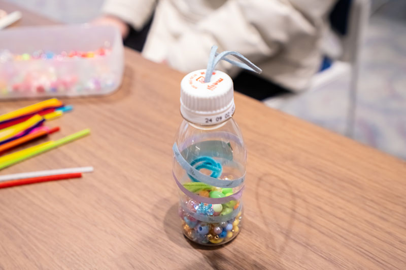 開演前、ホールのロビーでは、コンサートで使うペットボトルマラカス作りのワークショップが開かれました。観客として来場した子どもたちが楽しそうにマラカス作りにトライ。好きな色のビーズをスプーンですくって、ボトルに入れます。
